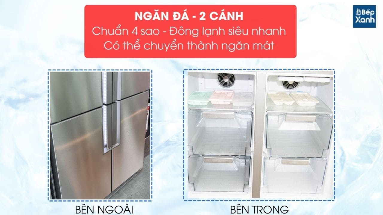 Ngăn này gồm 4 hộc đựng thực phẩm lớn, 2 khay đựng đá viên và 2 quạt thổi bên trong. Tương tự ngăn mát, ngăn đá cũng có chức năng đông lạnh siêu nhanh đạt chuẩn 4 sao.