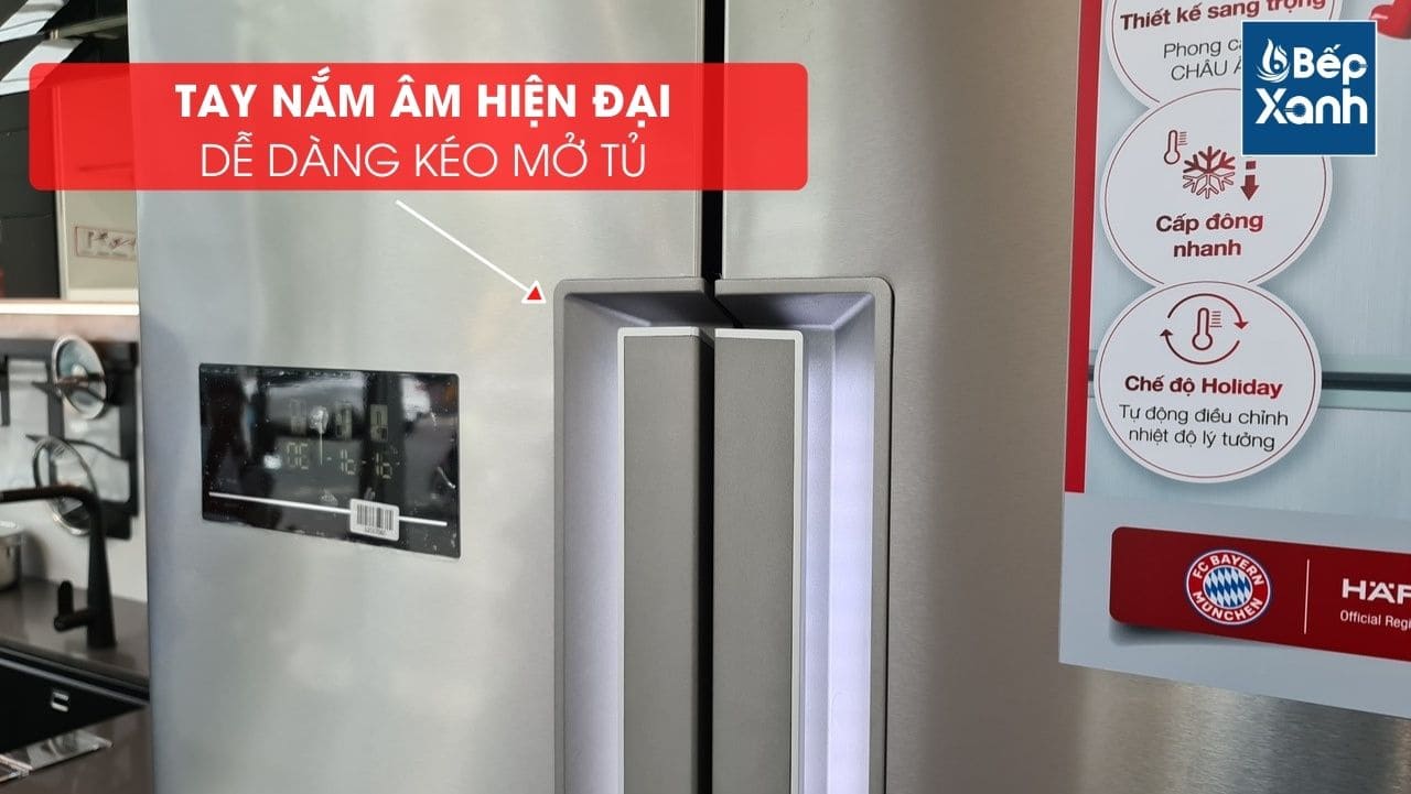 Phụ kiện cửa được xem là thế mạnh của thương hiệu Hafele, do đó phần tay nắm cửa tủ lạnh cũng được hoàn thiện chỉn chủ theo dạng lắp âm. Vừa đáp ứng nhu cầu kéo mở thuận tiện, vừa làm tăng tính thẩm mỹ cho sản phẩm.