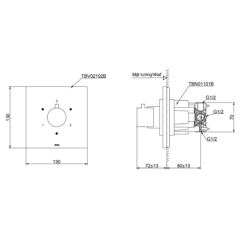 Kích thước van chuyển hướng TOTO TBV02102B/TBN01101B
