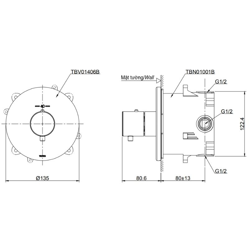 Kích thước van điều chỉnh nhiệt độ TOTO TBV01406B/TBN01001B