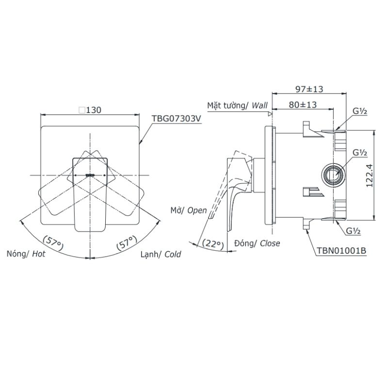 Kích thước van điều chỉnh nóng lạnh TOTO TBG07303V/TBN01001B