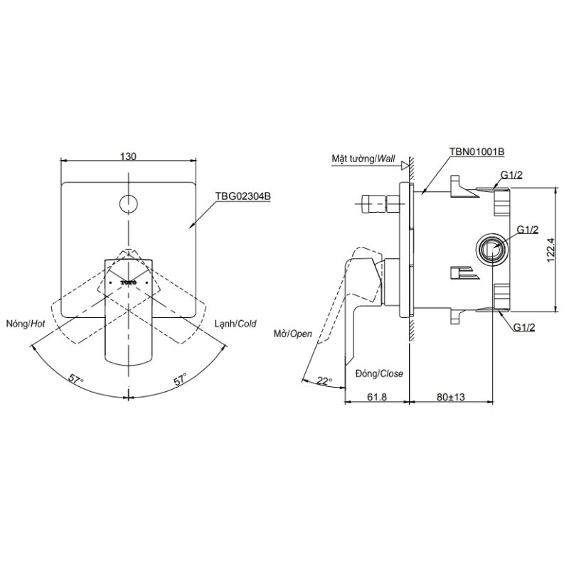 Kích thước van gật gù nóng lạnh TOTO TBG02304B/TBN01001B