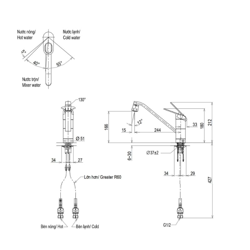 Kích thước sản phẩm vòi rửa chén TOTO TKGG31EC: