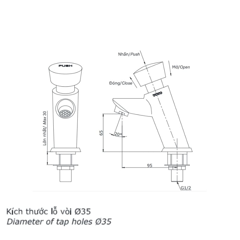 Phía trên đầu vòi bán tự động TOTO DL102 là nút "PUSH". Khi cần lấy nước, bạn chỉ cần ấn nút này xuống, nước sẽ tự động chảy và tự tắt sau khoảng 20s (tùy vào áp lực nước). Tính năng tự động này rất hữu ích, tránh tình trạng quên đóng nước sau mỗi lần sử dụng. Đây là điểm cộng hoàn hảo cho sản phẩm.