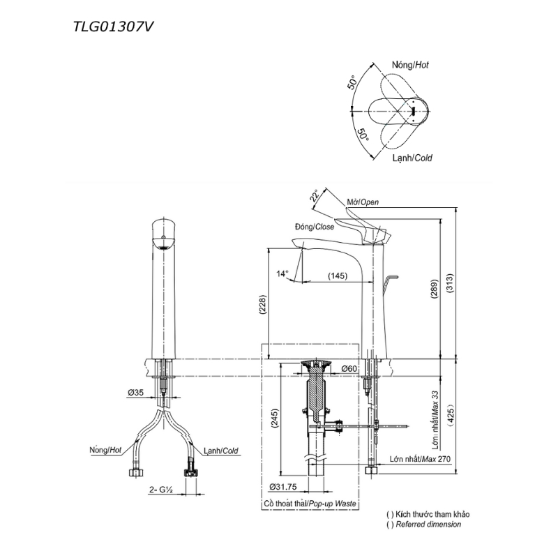 Kích thước sản phẩm vòi chậu TOTO TLG01307V: