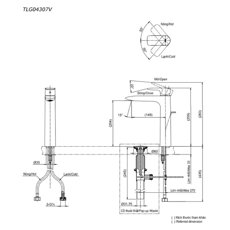 Kích thước sản phẩm vòi chậu TOTO TLG04307V: