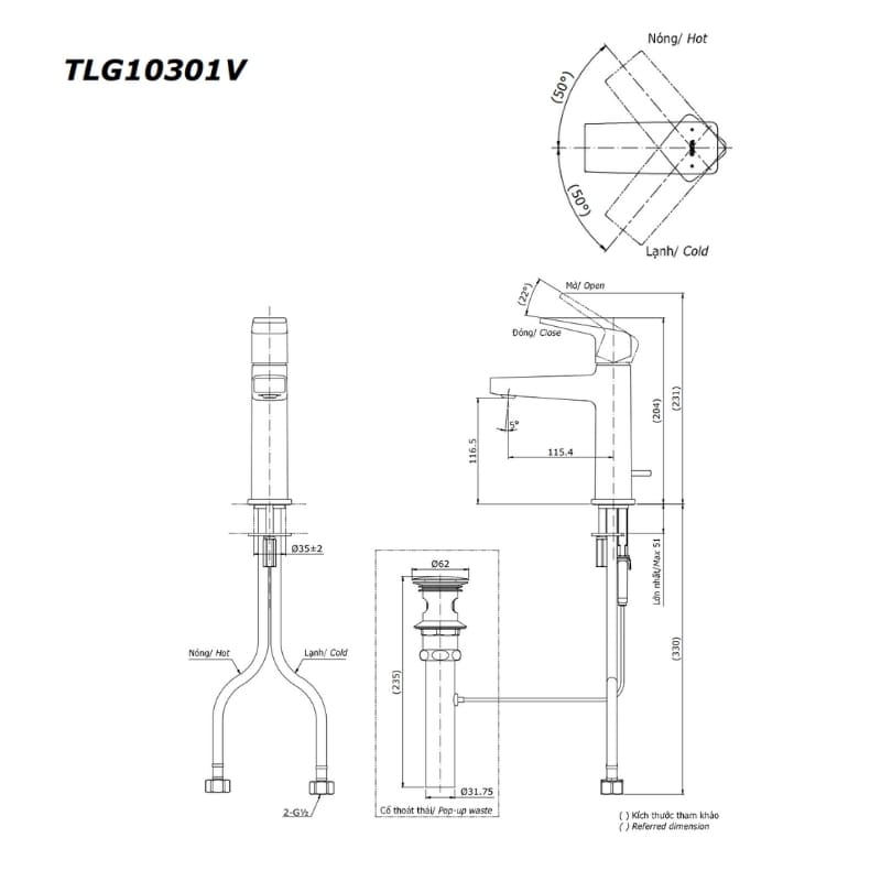 Kích thước sản phẩm vòi chậu TOTO TLG10301V: