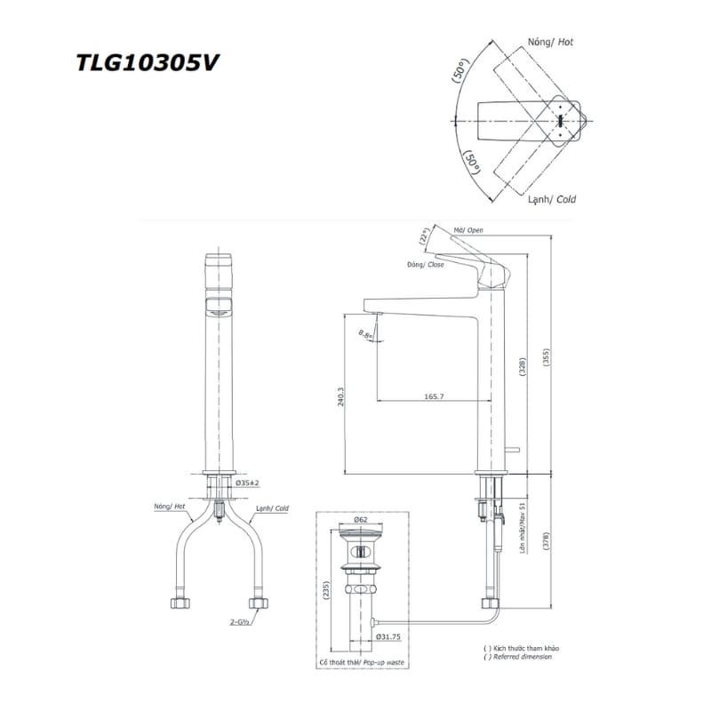 Kích thước sản phẩm vòi chậu TOTO TLG10305V:
