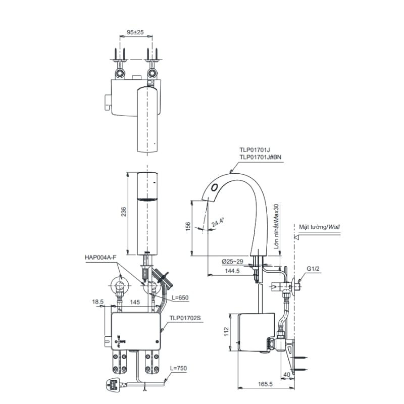 Kích thước lắp đặt vòi chậu tự động ToTo TLP01701J#BN/TLP01702S