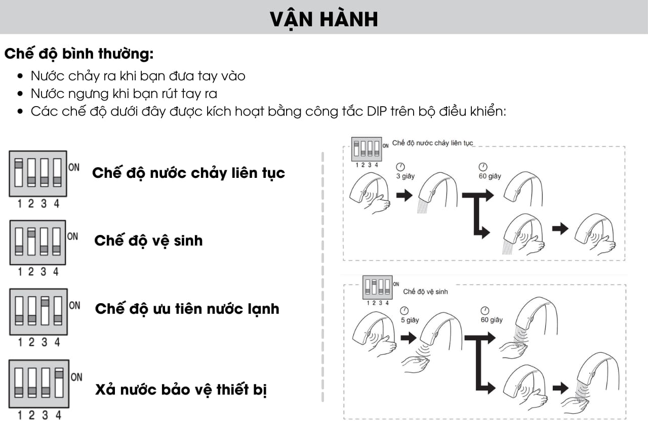 - Chế độ vệ sinh: Nếu bạn đưa tay ra trước cảm biến trong 10 giây, đèn chỉ báo sẽ tắt trong 5 giây. Ở chế độ này dù có đưa tay ra trước cảm biến thì nước cũng không chảy ra trong vòng tối đa 1 phút. Nếu bạn đưa tay ra trước cảm biến một lần nữa, nước sẽ chảy ra.