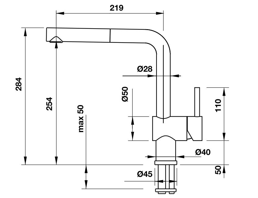 Kiểu dáng thiết kế hình chữ L hiện đại, đầu vòi có thể rút ra và xoay 140º.