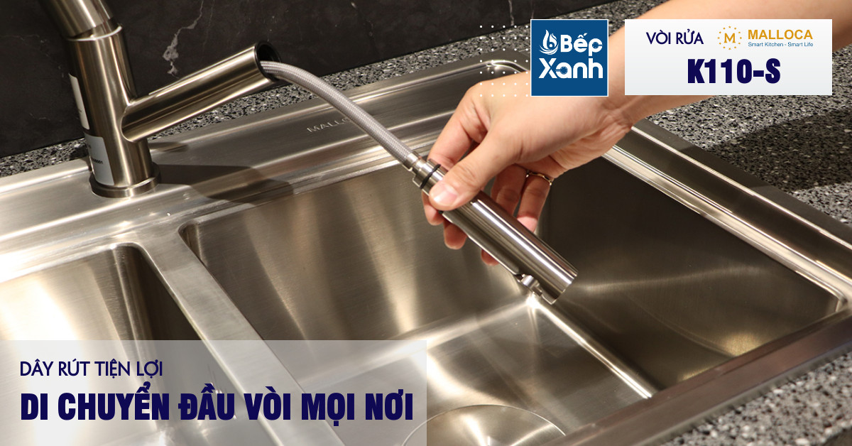 Vòi rửa chén dây rútMalloca K110-S là sản phẩm vòi rửa inox 304, phù hợp với các loại chậu rửa chén Inox 2 hộc rửa. Với đầu vòi có thể rút ra kéo vào linh hoạt, bạn sẽ rất dễ dàng vệ sinh chậu rửa chén cũng như vệ sinh mặt bàn xung quanh, tiết kiệm thời gian và công sức hơn các loại vòi rửa không có dây rút.