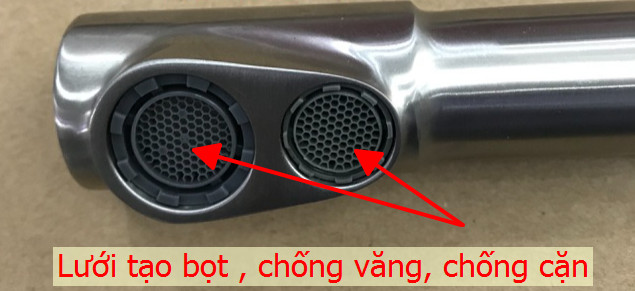 Đầu vòi rửa bát Faster FS 04SS cho 2 dòng nước riêng biệt, đầu tròn to là đầu ra của nguồn nước Nóng và Lạnh. Còn đầu tròn nhỏ hơn là đầu ra của nước máy lọc nước RO/Nano. Thiết kế đường nước riêng biệt giúp bạn không nhầm lẫn, và vệ sinh an toan thực phẩm hơn. Và nhìn chung 2 đầu đều có tấm lưới tạo bọt chống văng khi sử dụng.