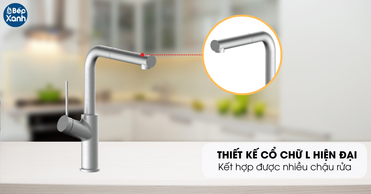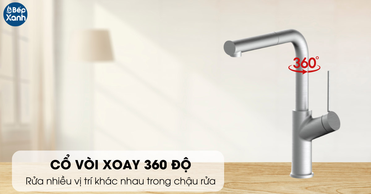 Một điểm cộng nữa cho vòi rửa chén HMH.F400420NB là được thiết kế dạng cổ xoay 360 độ linh hoạt, dễ dàng điều chỉnh hướng dòng nước chảy theo ý muốn thay vì cố định như các mẫu vòi thông thường. Nhờ đó việc vệ sinh xung quanh bồn rửa cũng trở nên dễ dàng hơn.