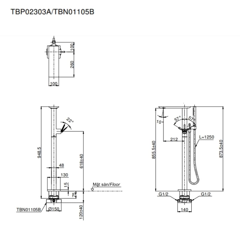 Vòi xả bồn đặt sàn TOTO TBP02303A/TBN01105B có kèm chân đế: