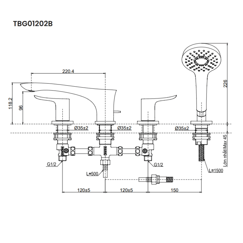 Thông số kỹ thuật của vòi xả bồn gắn bệ đá ToTo TBG01202B: