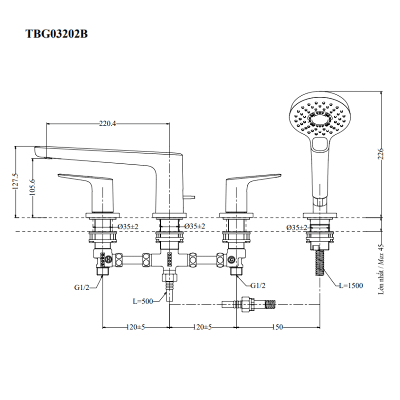 Thông số kỹ thuật của vòi xả bồn gắn bệ đá ToTo TBG03202B: