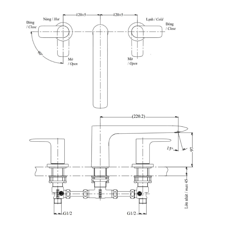 Mẫu vòi xả bồn của TOTO này có 2 nguồn nước nóng và lạnh, điều khiển thông qua tay gạt nước riêng biệt ở 2 bên. Bên dưới mỗi tay gạt đều có ký hiệu vòng tròn, bên phải là màu xanh tượng trưng cho nước lạnh và bên phải màu đỏ tượng trưng cho nước nóng. Từ đó, bạn có thể dễ phân biệt và thao tác lấy nước chính xác hơn.