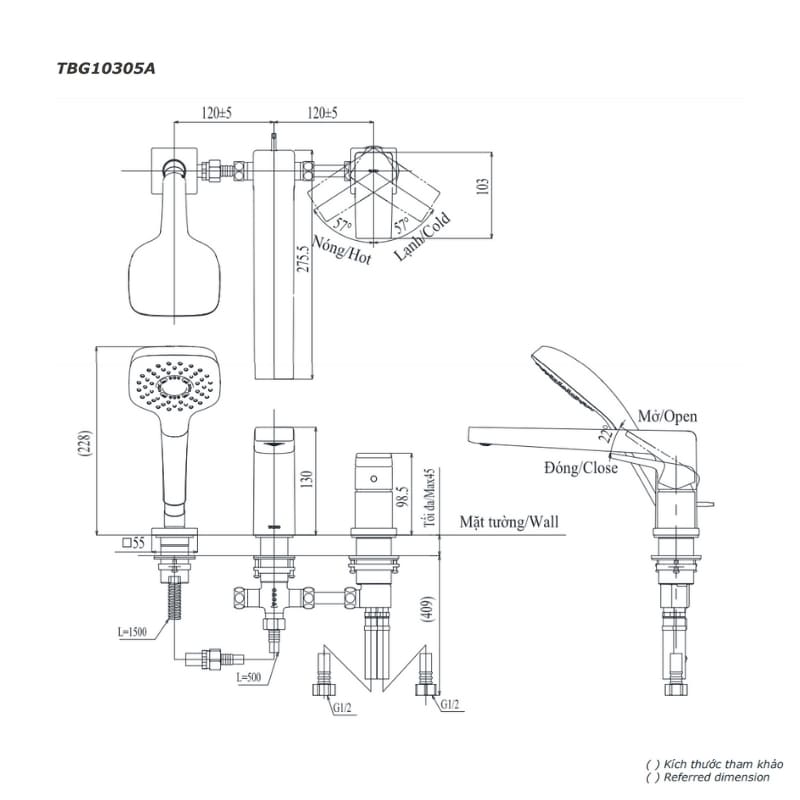 Kích thước sản phẩm vòi xả bồn nóng lạnh TOTO TBG10305A: