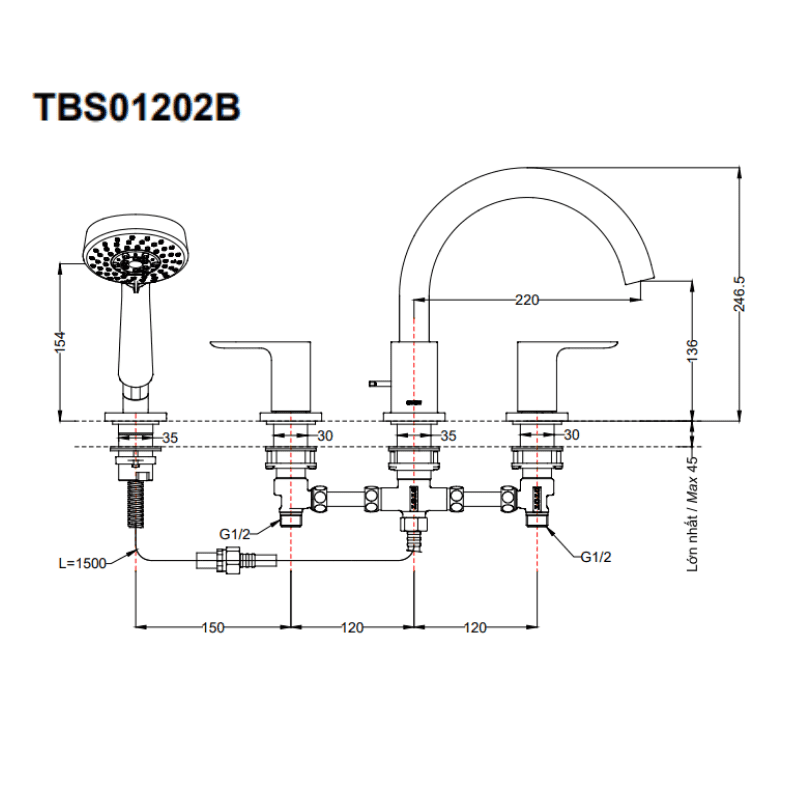 Mẫu vòi TBS01202B gồm 4 lỗ lắp đặt, từ trái sang phải là: tay gạt nước nóng, vòi xả nước, tay gạt nước lạnh và sen tắm. Các bộ phận đều được lắp đặt phần chân chắc chắc, không bị lung lay khi sử dụng đồng thời giúp nâng tầm không gian hơn và cho bạn trải nghiệm sử dụng thú vị khi tắm bồn hằng ngày.