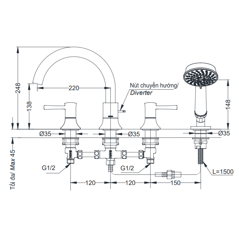 Mẫu vòi TBS02202B gồm 4 lỗ lắp đặt, từ trái sang phải là: tay gạt nước nóng, vòi xả nước, tay gạt nước lạnh và sen tắm. Các bộ phận đều được lắp đặt phần chân chắc chắc, không bị lung lay khi sử dụng đồng thời giúp nâng tầm không gian hơn và cho bạn trải nghiệm sử dụng thú vị khi tắm bồn hằng ngày.